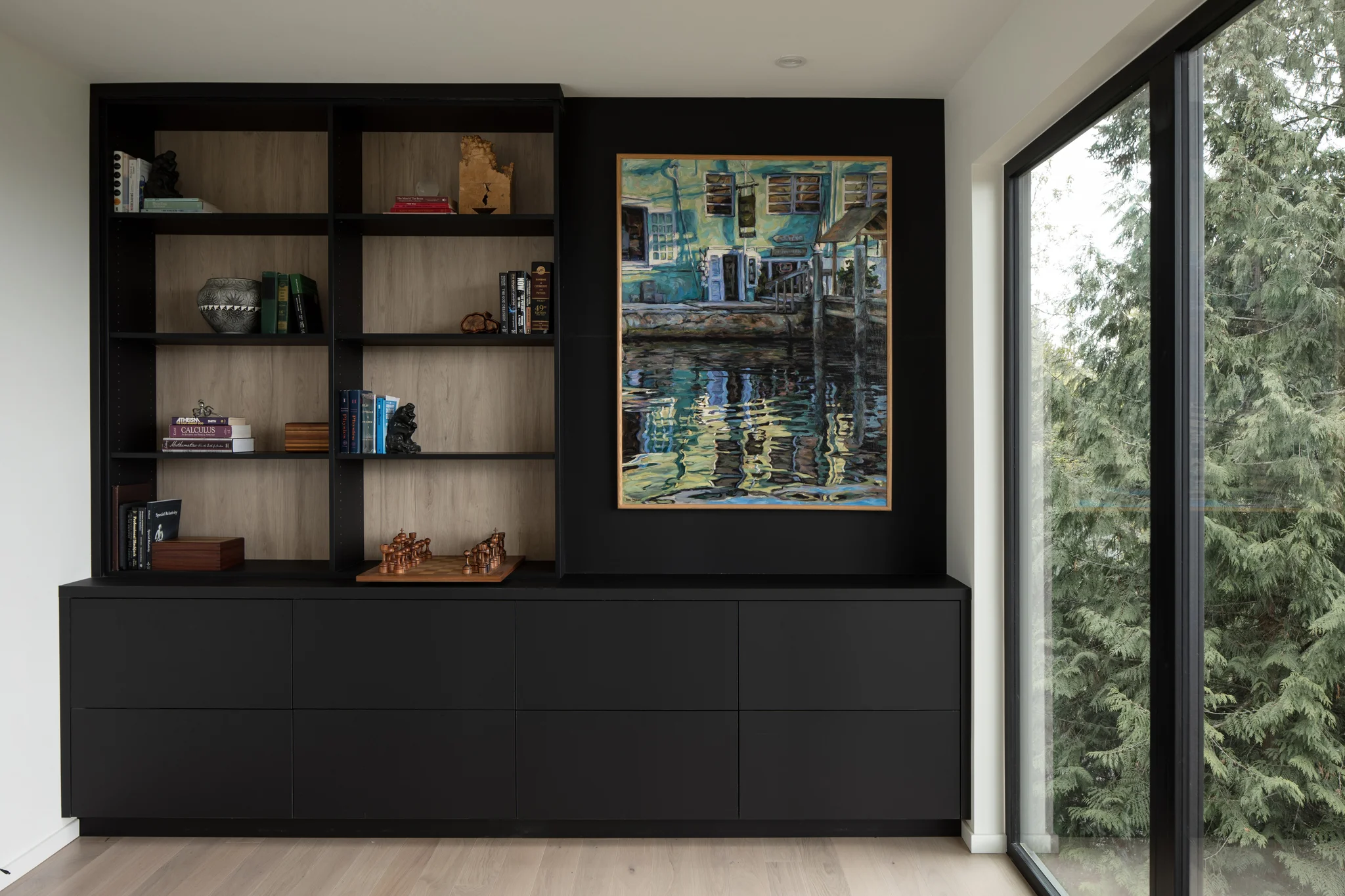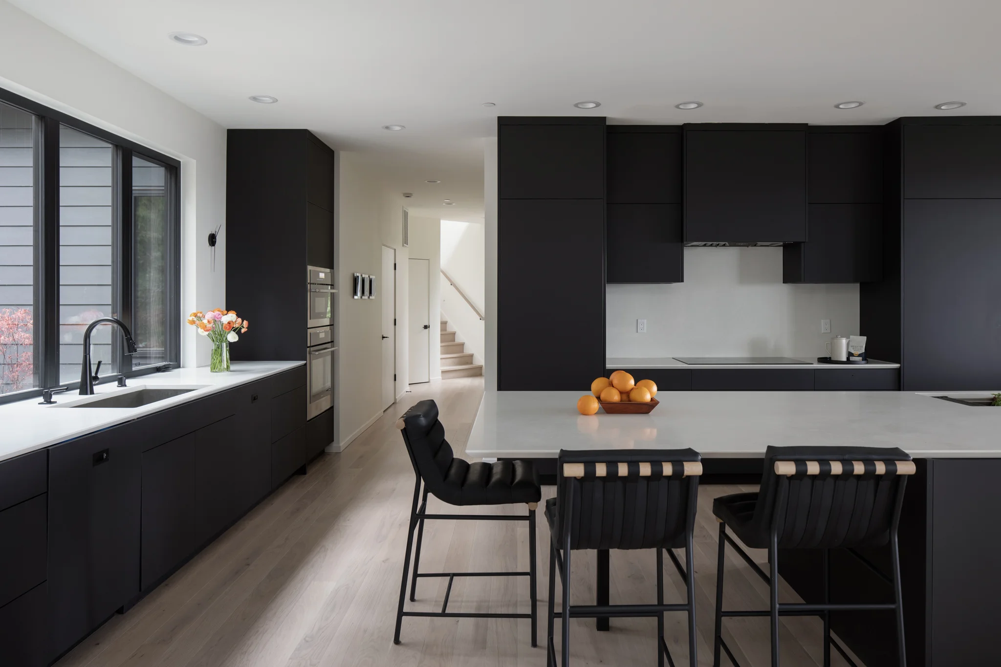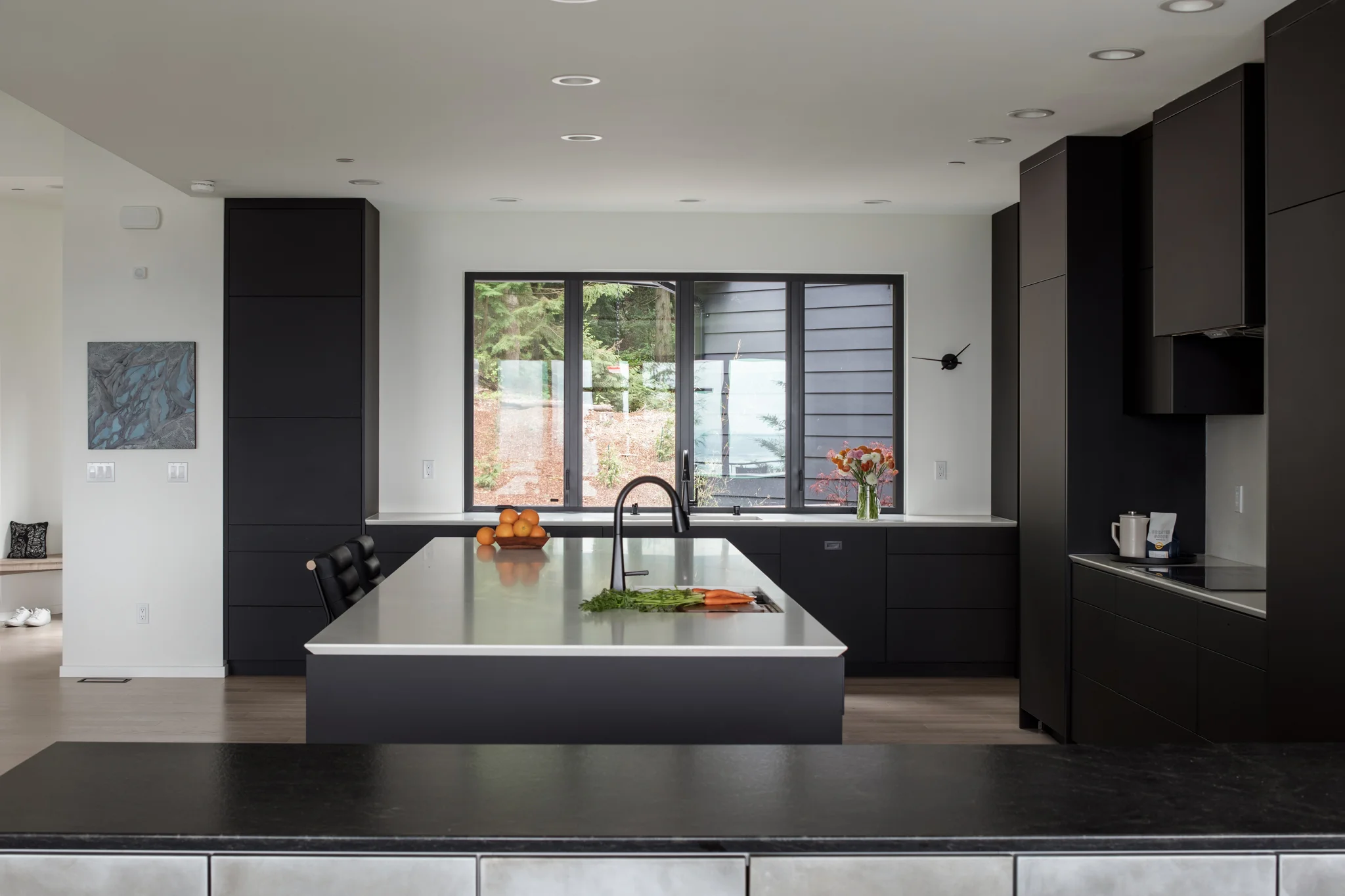 Located along the scenic byway in Bellingham, this modern kitchen features Acadia Craft’s custom cabinetry, crafted with Fenix Super Matte in black for a sleek, sophisticated look. The Fenix material’s fingerprint-resistant, scratch-resistant, and anti-glare properties make it perfect for high-end, functional design. This project showcases Acadia’s ability to deliver modern, custom cabinets that not only elevate aesthetics but also offer long-lasting durability and practicality.