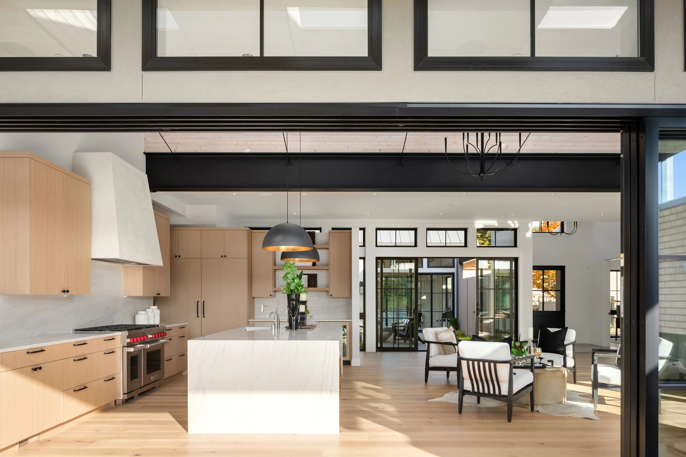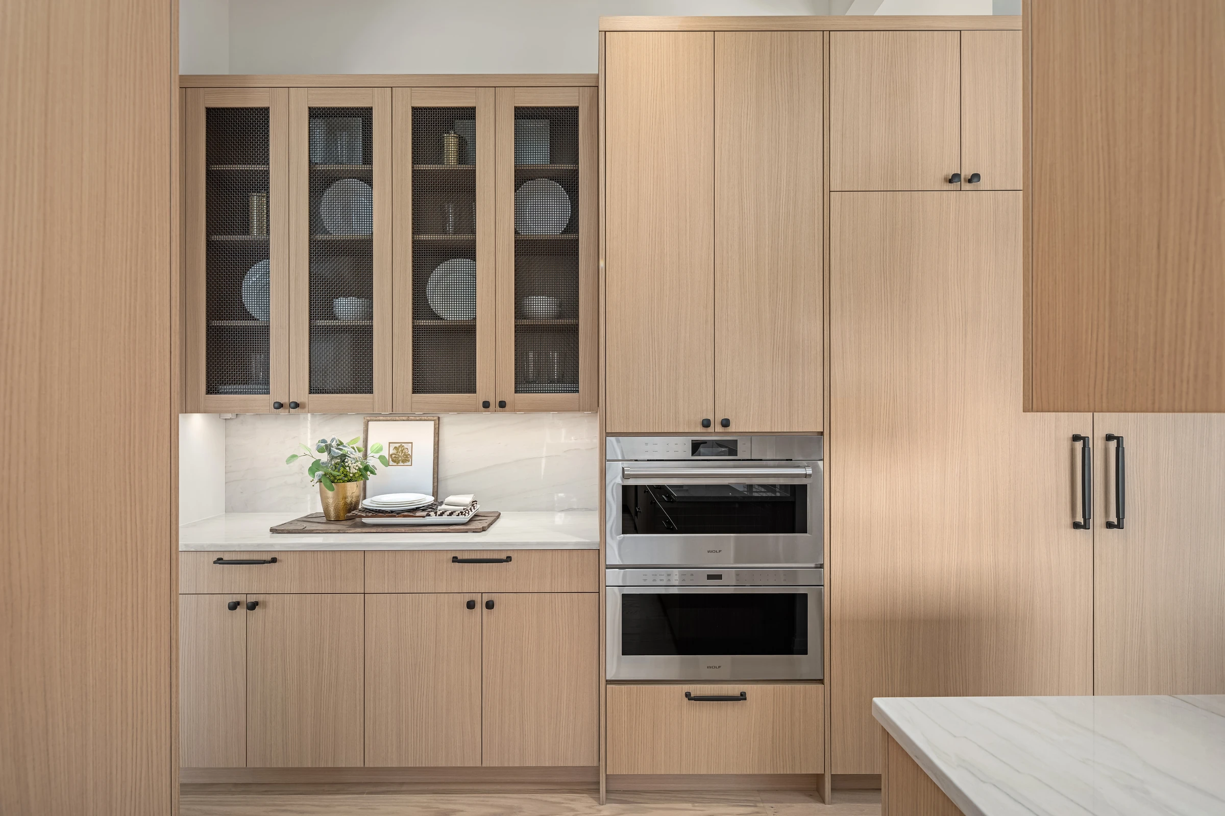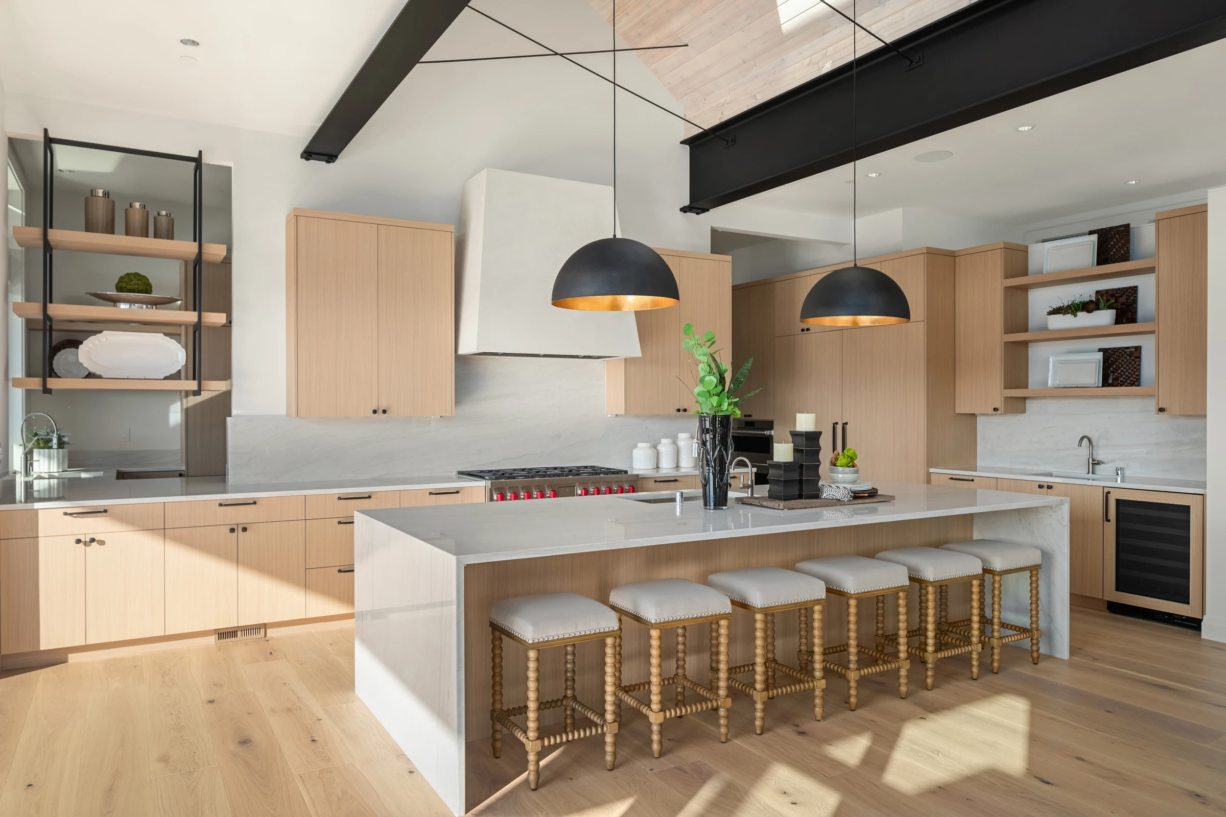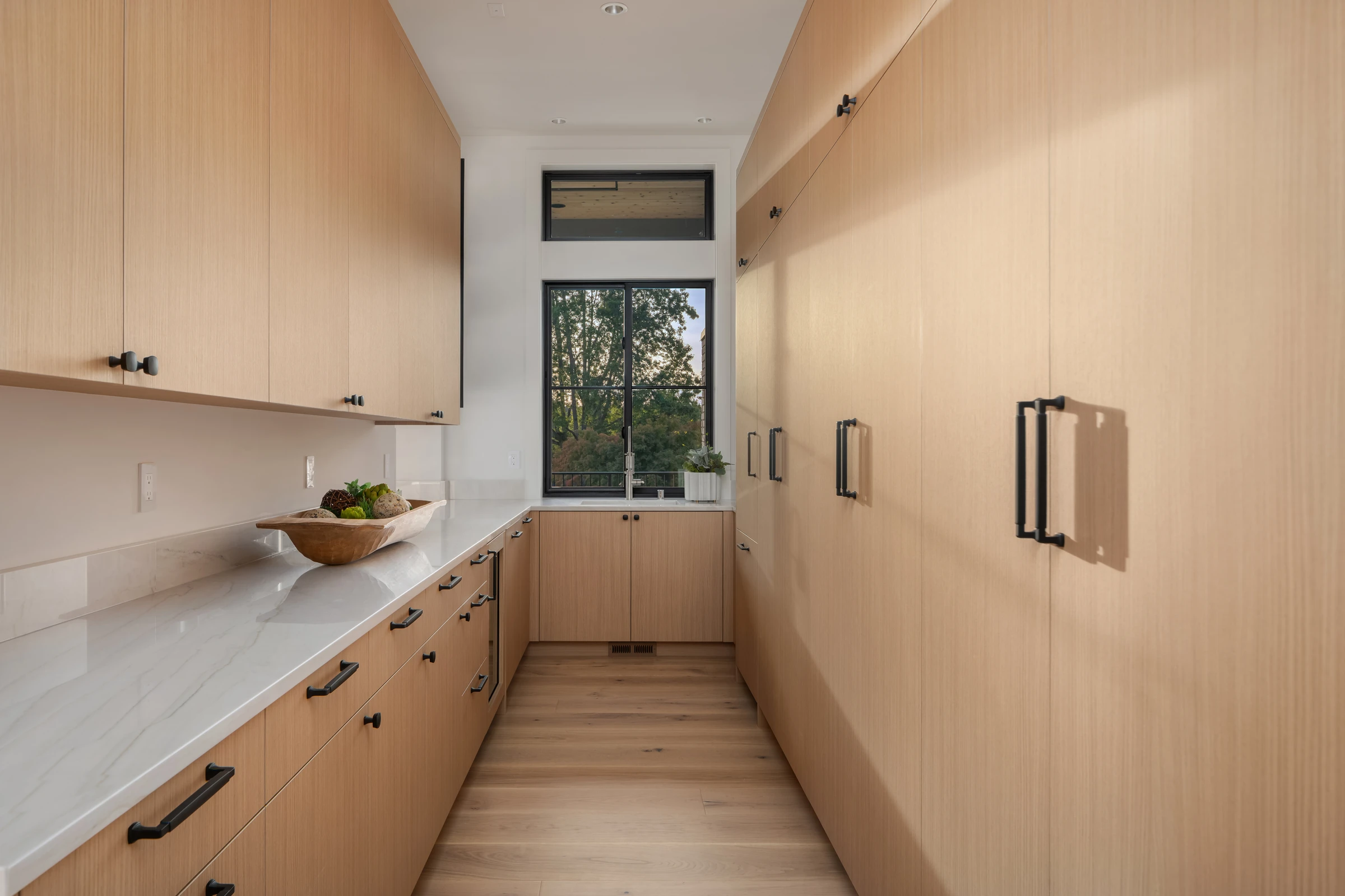 This Clyde Hill residence exemplifies Acadia Craft’s commitment to modern design and superior craftsmanship. The kitchen features sleek, flat-panel cabinetry in a warm wood finish, complemented by minimalist hardware and clean lines. Integrated appliances and a spacious island enhance functionality while maintaining a streamlined aesthetic. The open-concept layout, paired with large windows, allows natural light to flood the space, highlighting the meticulous attention to detail and high-quality materials used throughout. This project showcases our ability to blend form and function, creating a kitchen that is both beautiful and practical.