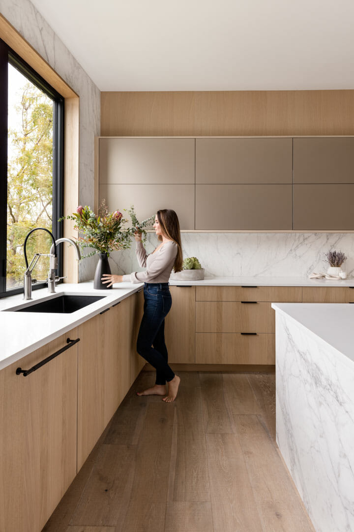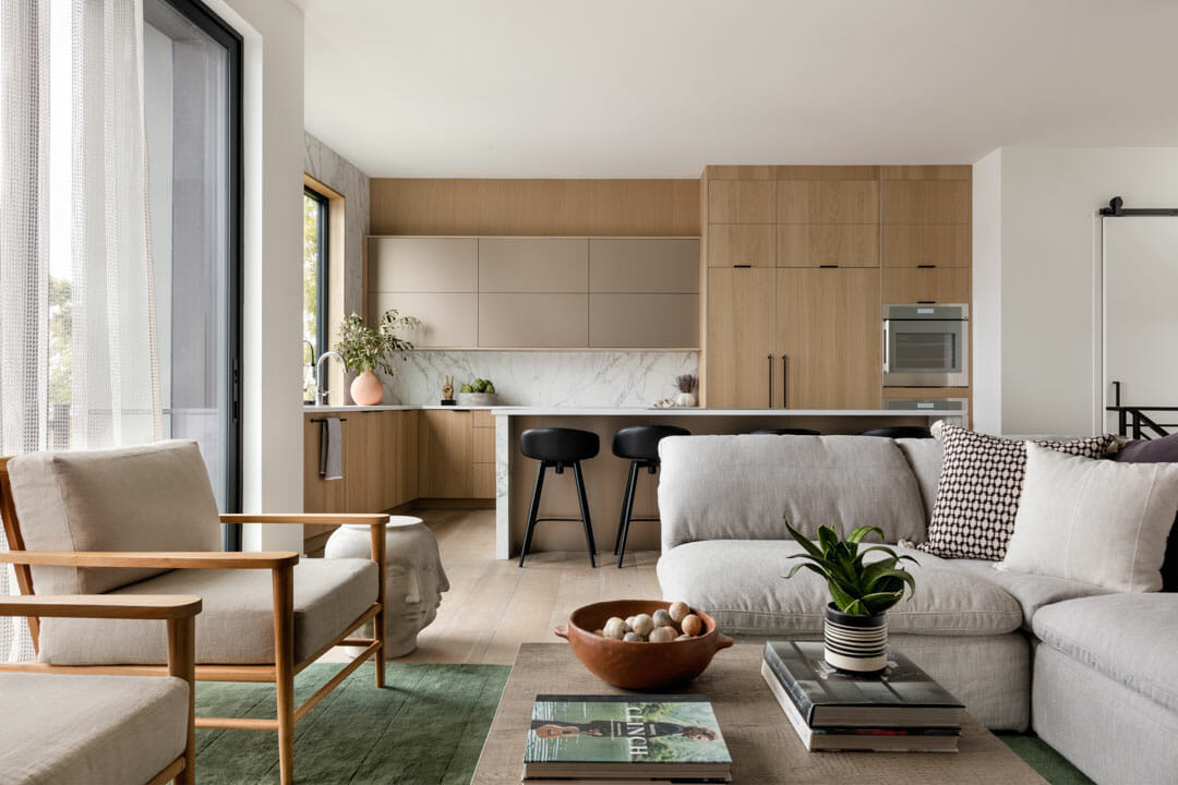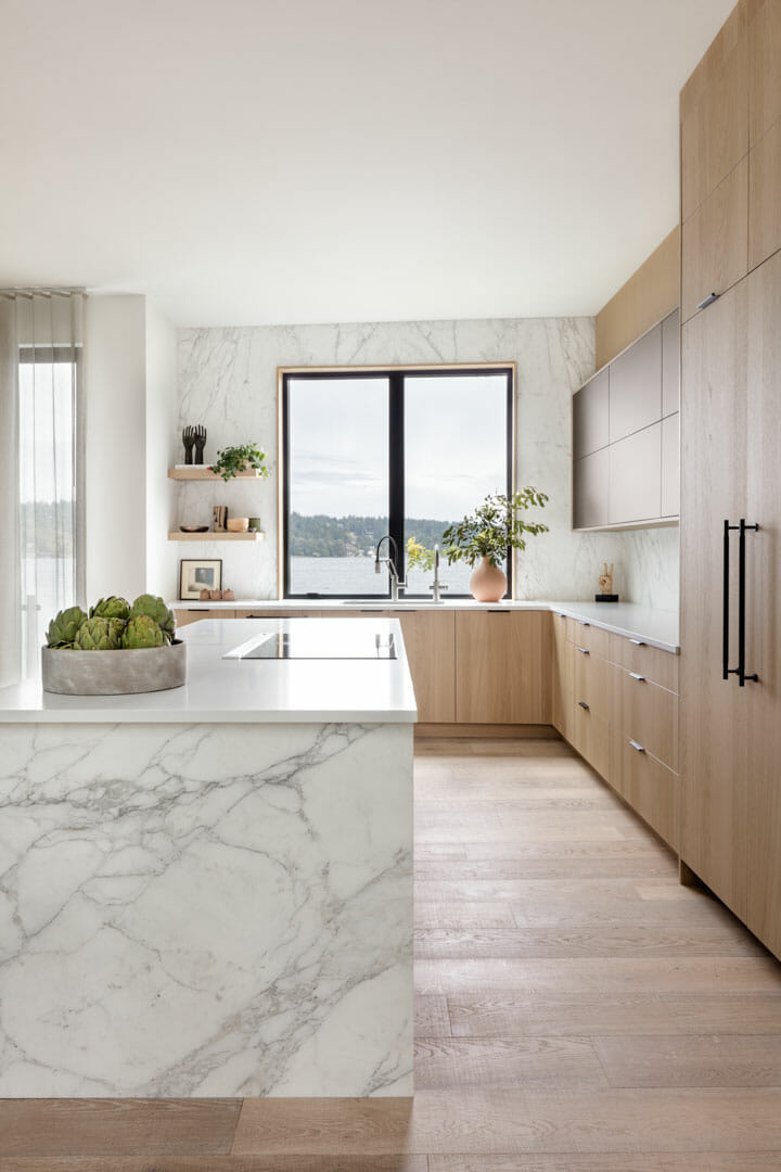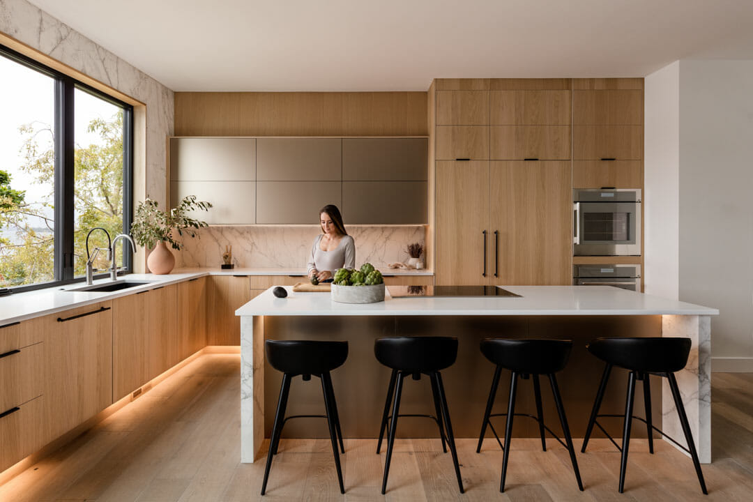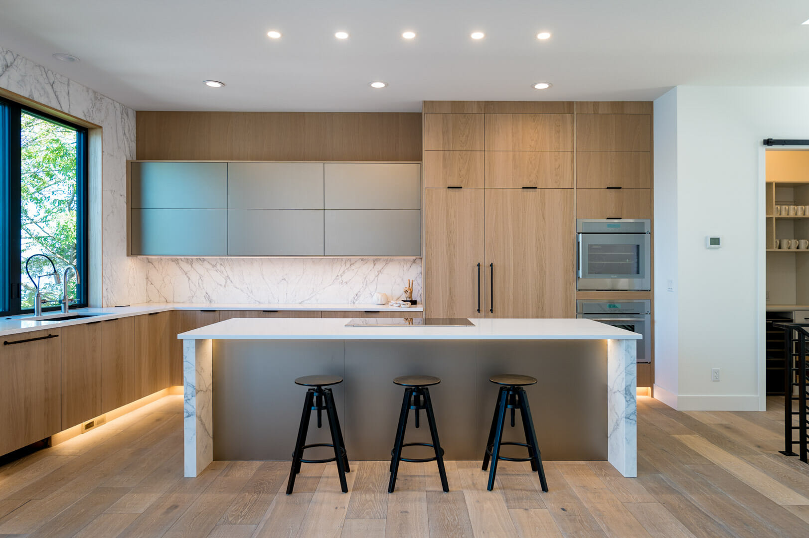 Project Description: With a waterfront view and 10-foot height ceiling, this project calls for full heigh grain match white oak, floor to ceiling.