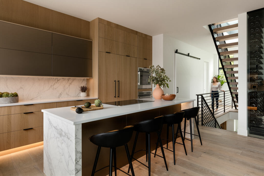 Our clients wanted a unique look with bronze glass door fronts and warm tones with LED lighting for the kitchen. Our Euro Cabinets provide full access for their Upper Bi-Folding “BLUM HF” door system with motorized touch to open system. Working in collaboration with interior designs Acadia was able to manufacture and execute and beautiful product for this project.