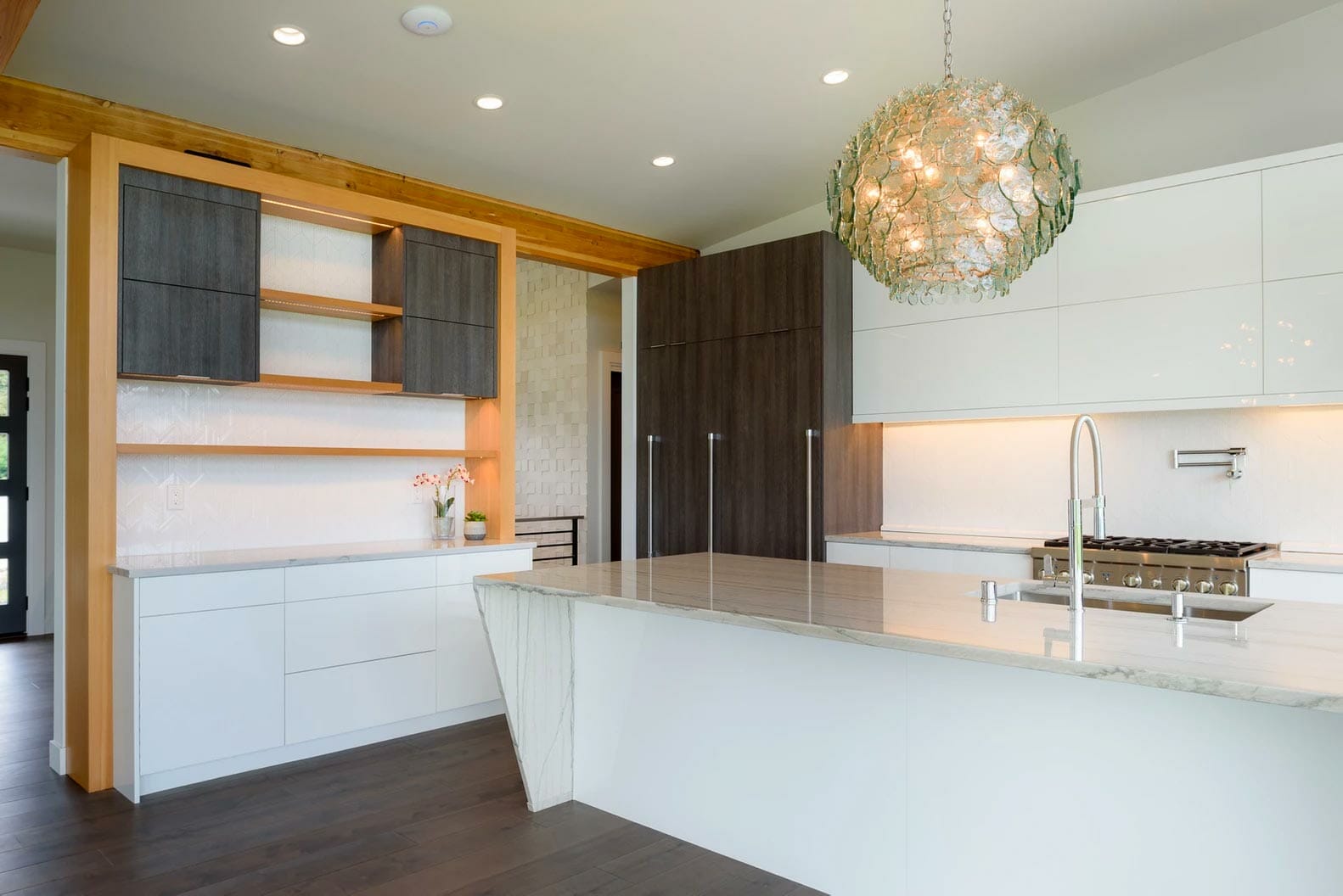 In addition, we were incredibly strategic about the way we positioned the drawers and inserts and added advanced features such as the BLUM HF lift up with SERVO motor mechanism. The clients were left with beautiful, white glossy cabinets that reflect downtown Bellevue and Lake Washington. They were pleased with the incredible quality and functionality they gained.
