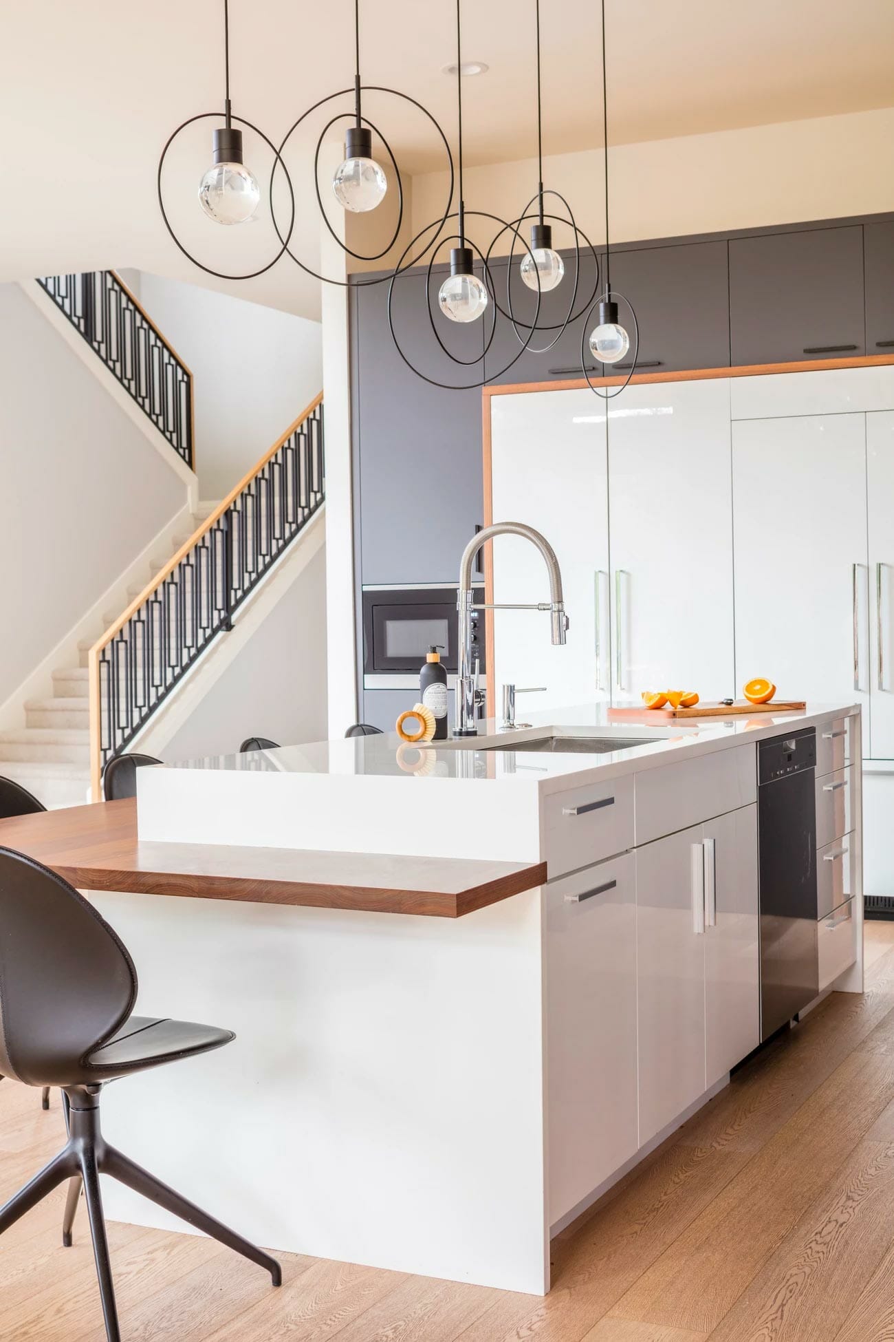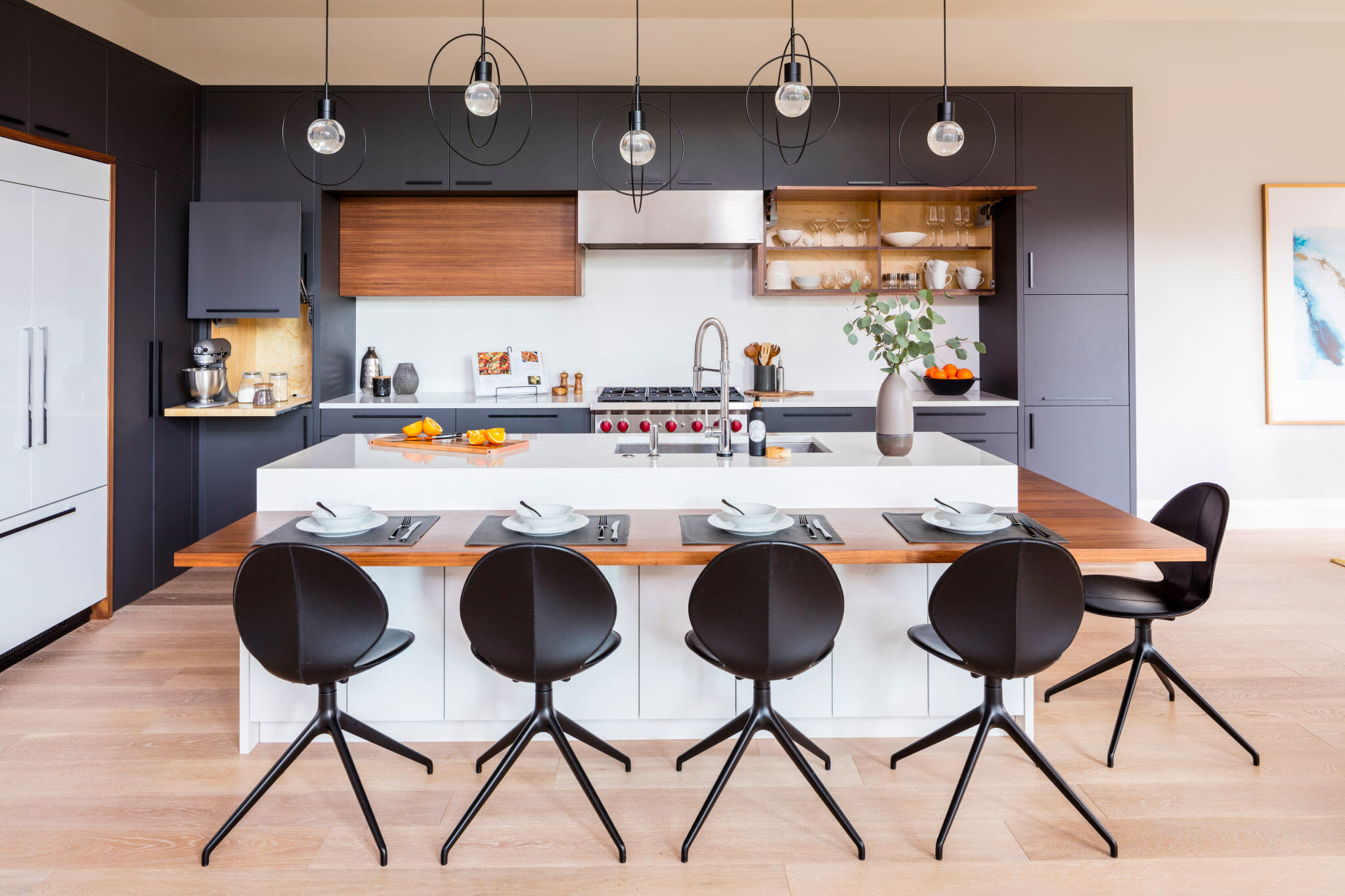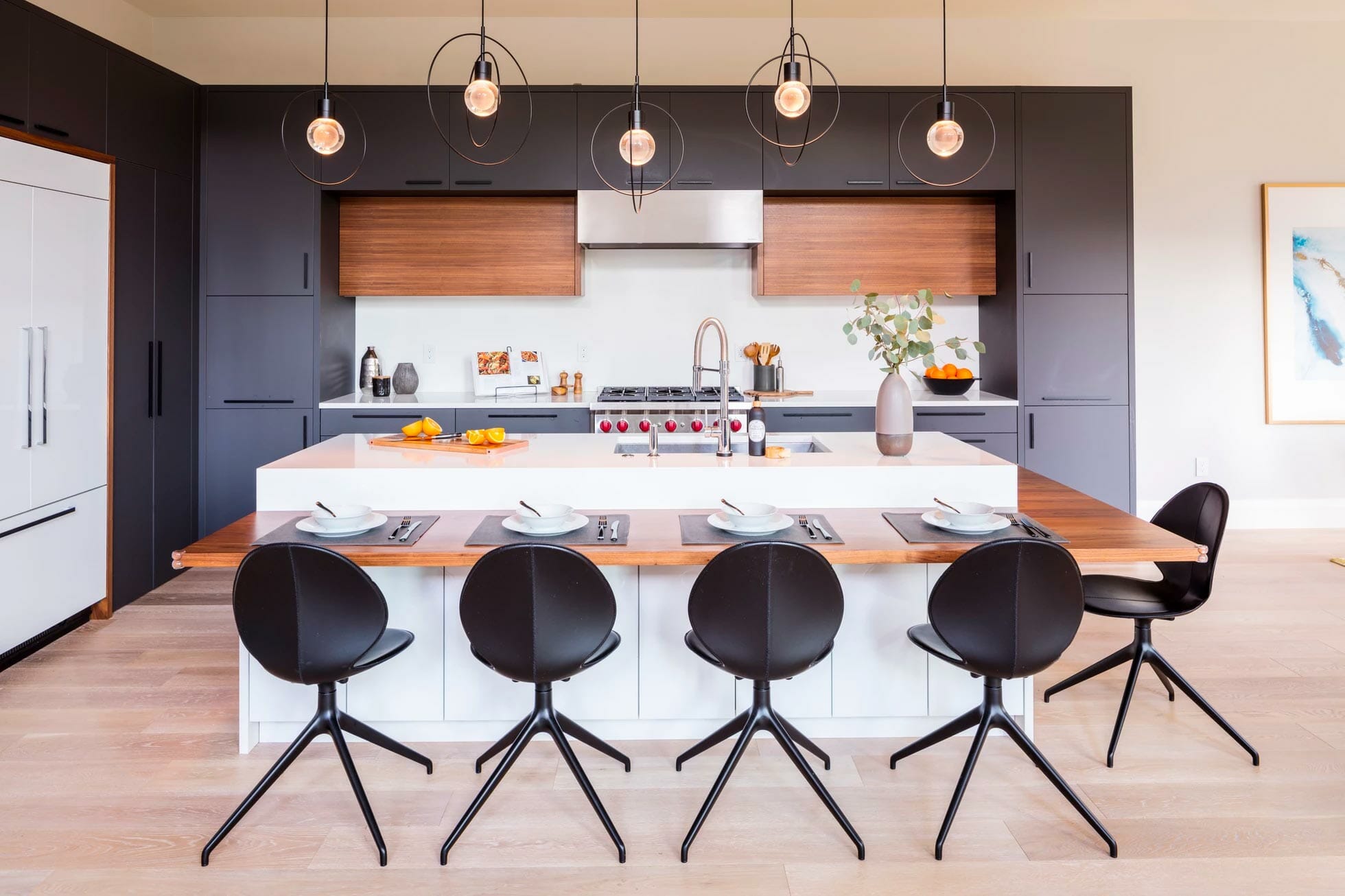 We sat down with our clients to understand the exact type of kitchen design esthetic and function they were seeking. Then, we got to work and paired dark bold modern material colors with warm wood tones to create that “wow factor” they were going for.