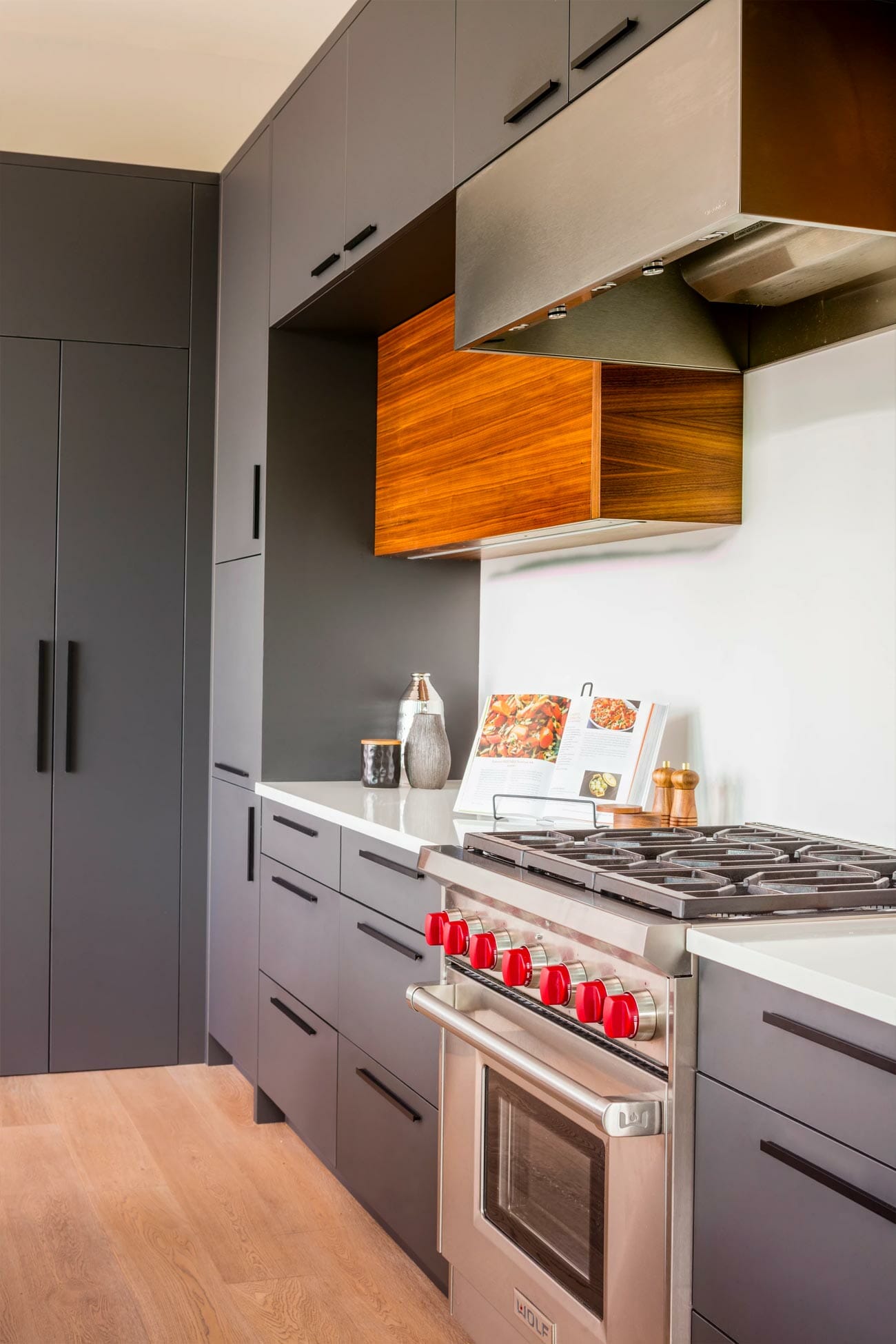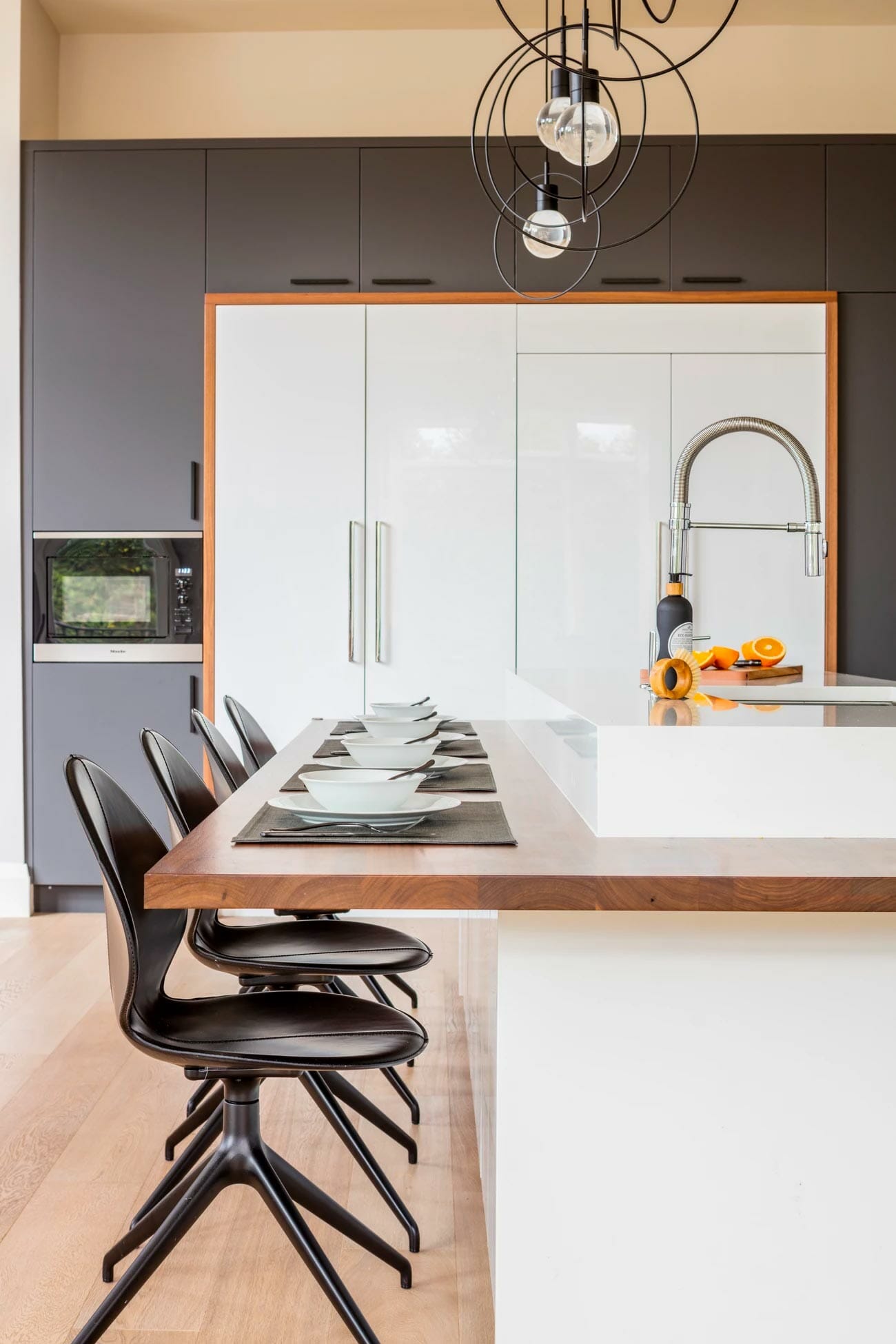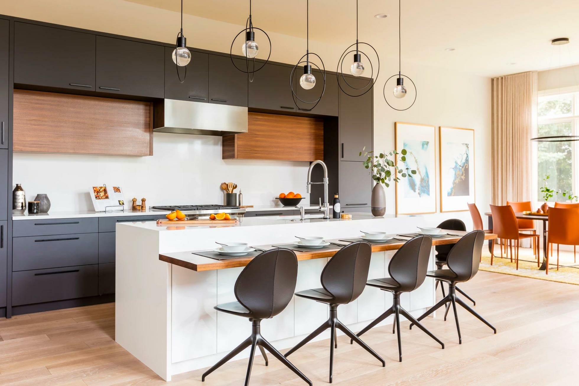 We sat down with our clients to understand the exact type of kitchen design esthetic and function they were seeking. Then, we got to work and paired dark bold modern material colors with warm wood tones to create that “wow factor” they were going for.