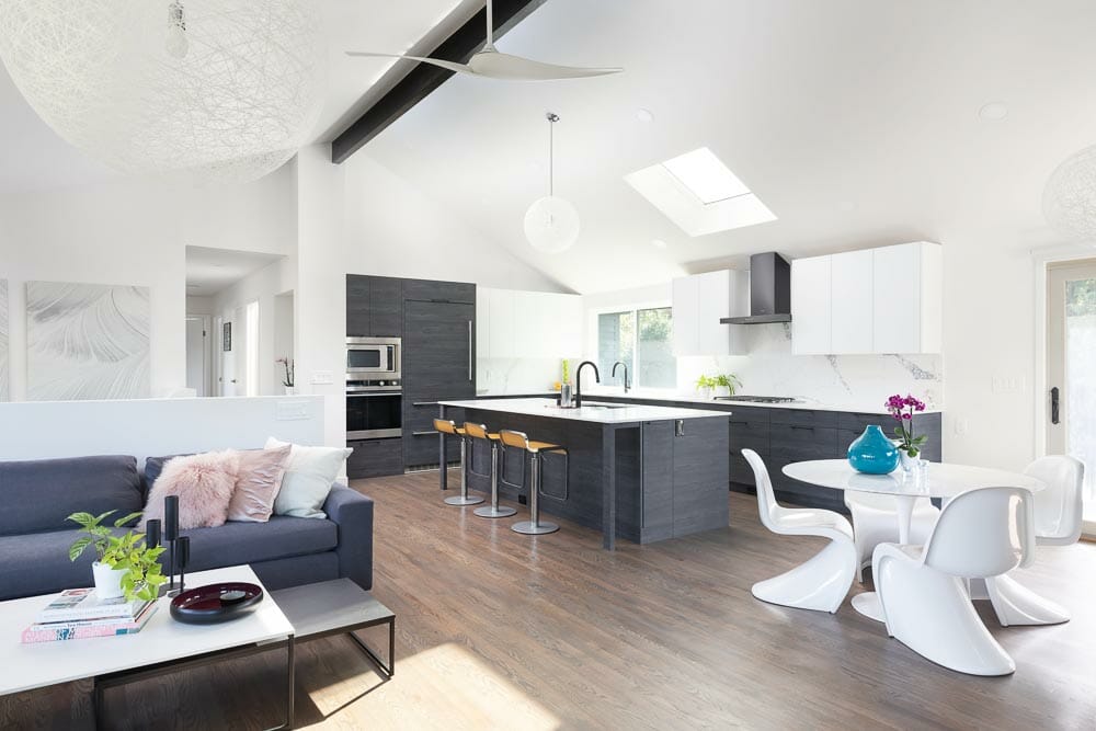 Project Description: Located in Central Houghton lakeside neighborhood of the city of Kirkland, this contemporary kitchen renovation shows the true beauty of our cabinetry. Cabinets were done in a combination of Loft Oak soft touch finish and White matte soft touch material.